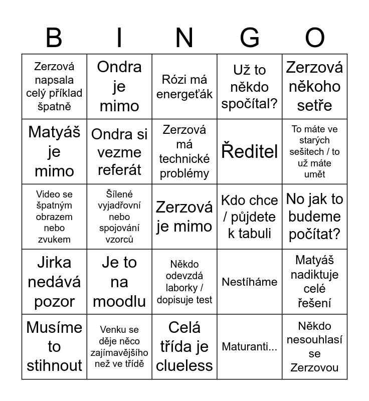 This bingo card has 25 words: Je to na moodlu, Celá třída je clueless, Zerzová má technické problémy, Musíme to stihnout, Zerzová někoho setře, Zerzová napsala celý příklad špatně, Matyáš je mimo, Ondra je mimo, Kdo chce / půjdete k tabuli, Někdo odevzdá laborky / dopisuje test, Ředitel, Video se špatným obrazem nebo zvukem, Nestíháme, Matyáš nadiktuje celé řešení, Ondra si vezme referát, Někdo nesouhlasí se Zerzovou, No jak to budeme počítat?, Rózi má energeťák, To máte ve starých sešitech / to už máte umět, Šílené vyjadřovní nebo spojování vzorců, Zerzová je mimo, Venku se děje něco zajímavějšího než ve třídě, Jirka nedává pozor, Už to někdo spočítal? and Maturanti....