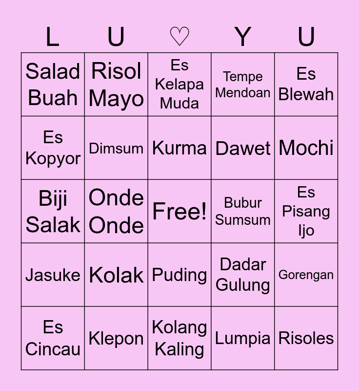 This bingo card has a free space and 24 words: Kolak, Klepon, Kurma, Es Cincau, Es Blewah, Salad Buah, Es Kopyor, Risol Mayo, Bubur Sumsum, Puding, Dawet, Biji Salak, Dadar Gulung, Gorengan, Dimsum, Lumpia, Es Pisang Ijo, Es Kelapa Muda, Mochi, Onde Onde, Risoles, Jasuke, Tempe Mendoan and Kolang Kaling.