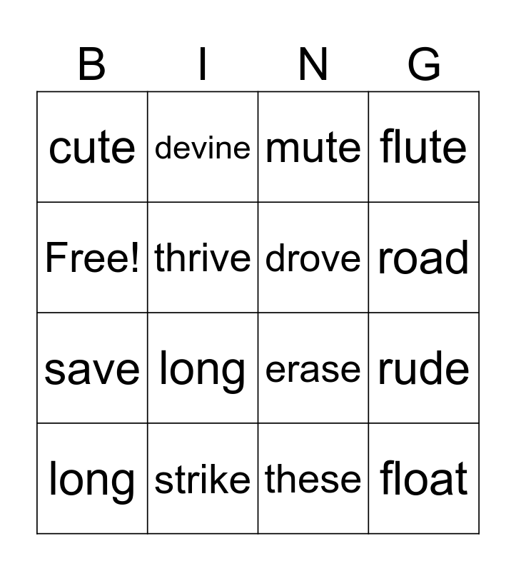 This bingo card has 16 words: strike, rude, mute, cute, save, devine, erase, these, Free!, thrive, long, flute, long, road, drove and float.