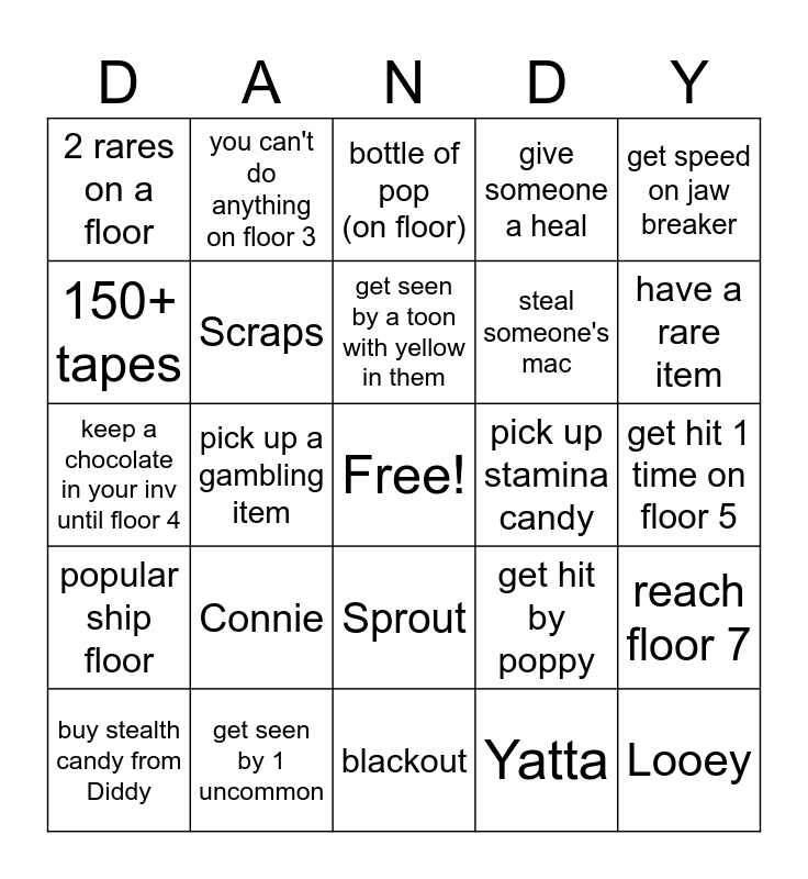 This bingo card has a free space and 24 words: buy stealth candy from Diddy, Connie, get seen by a toon with yellow in them, Yatta, get speed on jaw breaker, 2 rares on a floor, you can't do anything on floor 3, bottle of pop (on floor), pick up stamina candy, get hit 1 time on floor 5, keep a chocolate in your inv until floor 4, Scraps, get hit by poppy, reach floor 7, 150+ tapes, get seen by 1 uncommon, blackout, give someone a heal, have a rare item, popular ship floor, pick up a gambling item, Sprout, steal someone's mac and Looey.