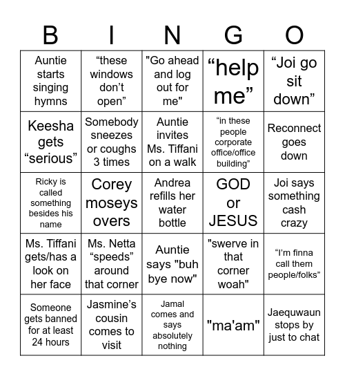 This bingo card has a free space and 24 words: Ms. Netta “speeds” around that corner, Jasmine’s cousin comes to visit, Auntie invites Ms. Tiffani on a walk, Someone gets banned for at least 24 hours, “Joi go sit down”, Auntie starts singing hymns, Keesha gets “serious”, “these windows don’t open”, GOD or JESUS, Auntie says "buh bye now", “in these people corporate office/office building”, Ricky is called something besides his name, "swerve in that corner woah", “I’m finna call them people/folks”, Somebody sneezes or coughs 3 times, "ma'am", Joi says something cash crazy, "Go ahead and log out for me", Reconnect goes down, Corey moseys overs, Jaequwaun stops by just to chat, Ms. Tiffani gets/has a look on her face, “help me” and Jamal comes and says absolutely nothing.