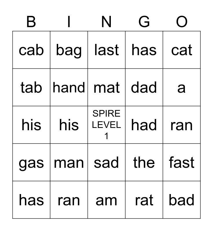 This bingo card has a free space and 24 words: man, ran, mat, has, cat, cab, tab, bag, had, sad, dad, his, the, fast, hand, rat, ran, last, a, his, bad, gas, has and am.