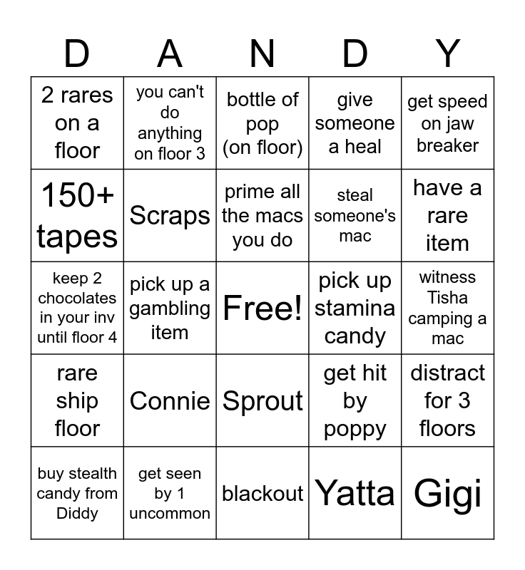 This bingo card has a free space and 24 words: buy stealth candy from Diddy, Connie, prime all the macs you do, Yatta, get speed on jaw breaker, 2 rares on a floor, you can't do anything on floor 3, bottle of pop (on floor), pick up stamina candy, witness Tisha camping a mac, keep 2 chocolates in your inv until floor 4, Scraps, get hit by poppy, distract for 3 floors, 150+ tapes, get seen by 1 uncommon, blackout, give someone a heal, have a rare item, rare ship floor, pick up a gambling item, Sprout, steal someone's mac and Gigi.