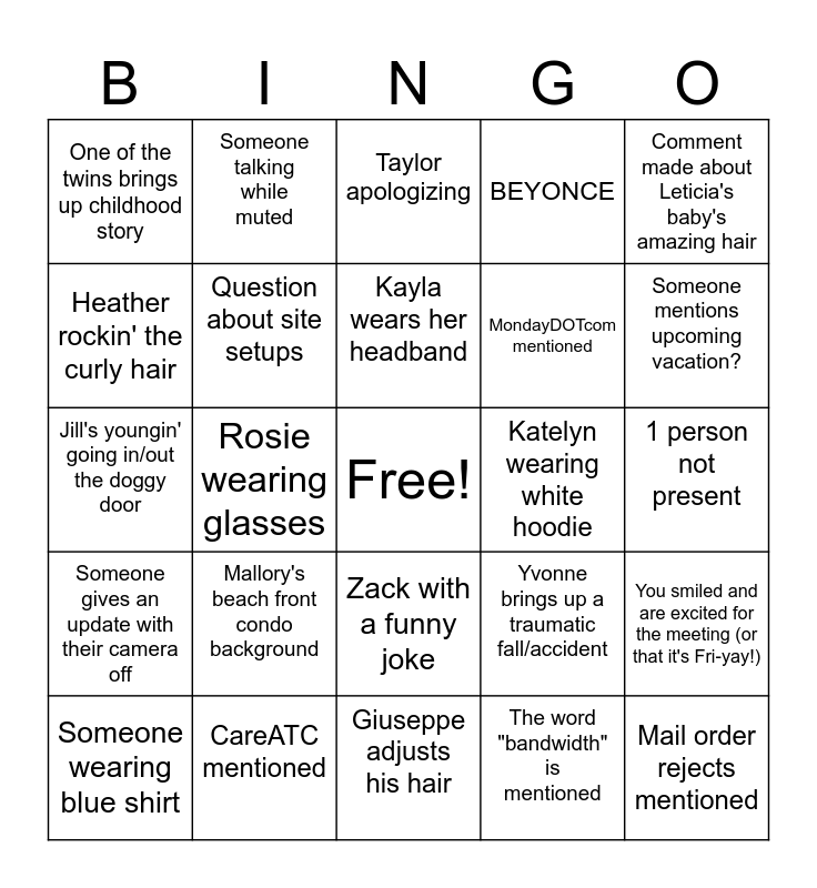This bingo card has a free space and 24 words: Mallory's beach front condo background, CareATC mentioned, Kayla wears her headband, Someone wearing blue shirt, Comment made about Leticia's baby's amazing hair, One of the twins brings up childhood story, Heather rockin' the curly hair, Someone talking while muted, Katelyn wearing white hoodie, Zack with a funny joke, MondayDOTcom mentioned, Jill's youngin' going in/out the doggy door, Yvonne brings up a traumatic fall/accident, You smiled and are excited for the meeting (or that it's Fri-yay!), Question about site setups, The word "bandwidth" is mentioned, 1 person not present, Taylor apologizing, Someone mentions upcoming vacation?, Rosie wearing glasses, Mail order rejects mentioned, Someone gives an update with their camera off, BEYONCE and Giuseppe adjusts his hair.