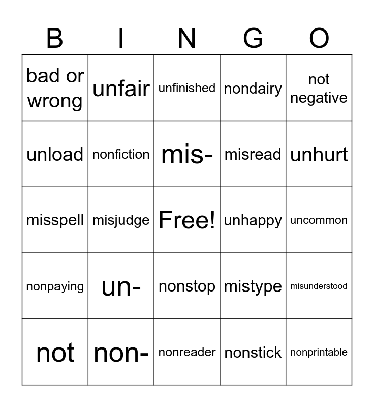 This bingo card has a free space and 24 words: un-, non-, mis-, not, not negative, bad or wrong, unload, unfair, unhappy, nonstop, misread, misspell, mistype, misunderstood, nonfiction, nonstick, uncommon, unfinished, unhurt, misjudge, nonprintable, nonpaying, nondairy and nonreader.