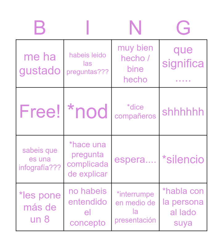 This bingo card has 16 words: no habeis entendido el concepto, *silencio, muy bien hecho / bine hecho, me ha gustado, sabeis que es una infografía???, habeis leido las preguntas???, espera...., *interrumpe en medio de la presentación, Free!, *nod, *les pone más de un 8, que significa ....., *hace una pregunta complicada de explicar, shhhhhh, *dice compañeros and *habla con la persona al lado suya.