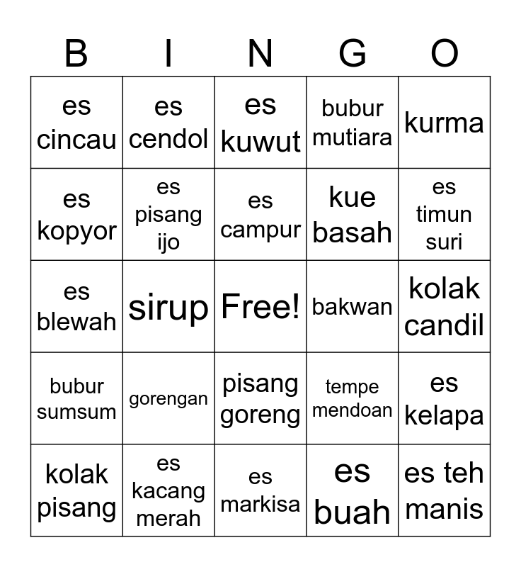 This bingo card has a free space and 24 words: kolak pisang, gorengan, es campur, es buah, kurma, es cincau, es cendol, es kuwut, bakwan, kolak candil, es blewah, es pisang ijo, tempe mendoan, es kelapa, es kopyor, es kacang merah, es markisa, bubur mutiara, es timun suri, bubur sumsum, sirup, pisang goreng, kue basah and es teh manis.
