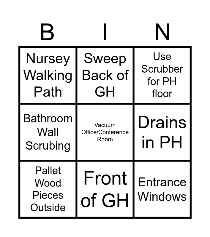 This bingo card has a free space and 8 words: Drains in PH, Use Scrubber for PH floor, Sweep Back of GH, Pallet Wood Pieces Outside, Nursey Walking Path, Entrance Windows, Bathroom Wall Scrubing and Front of GH.