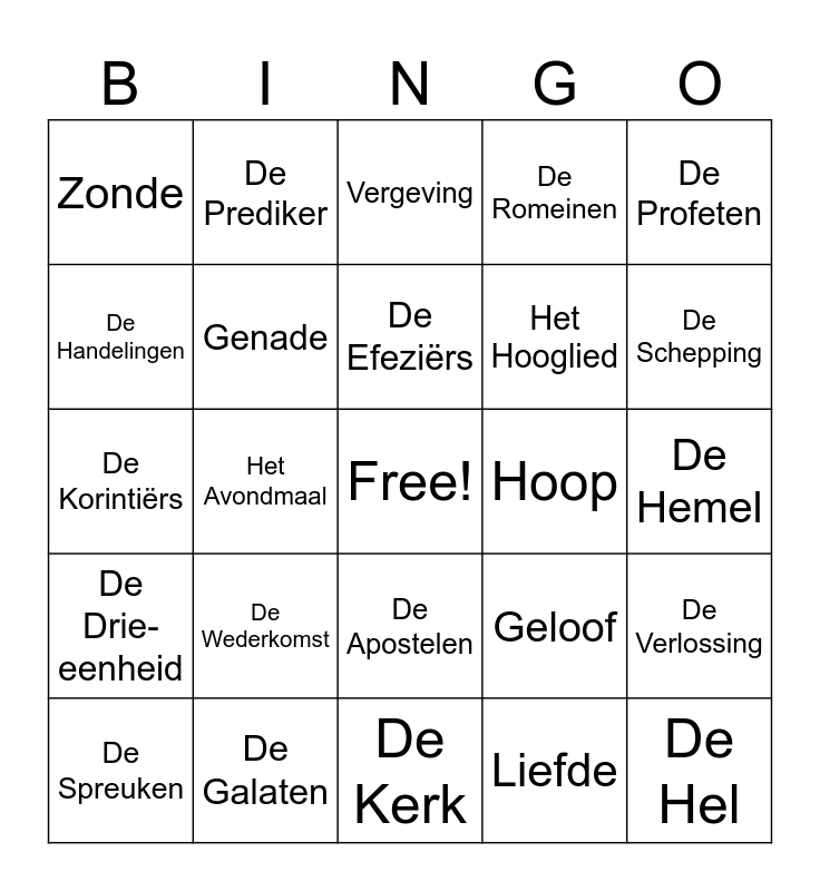 This bingo card has a free space and 31 words: De Kerk, De Doop, Het Avondmaal, Gebed, Zonde, Vergeving, Genade, Geloof, Hoop, Liefde, De Hemel, De Hel, De Duivel, Engelen, De Schepping, De Zondeval, De Verlossing, De Wederkomst, De Drie-eenheid, De Apostelen, De Profeten, De Psalmen, De Spreuken, De Prediker, Het Hooglied, De Handelingen, De Romeinen, De Korintiërs, De Galaten, De Efeziërs and De Filippenzen.