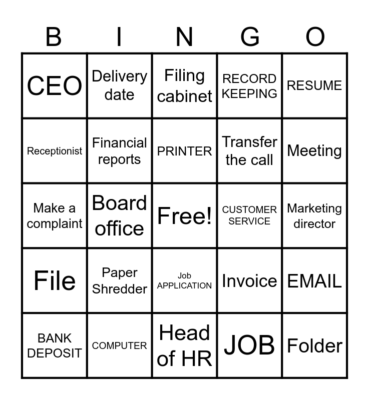 This bingo card has a free space and 24 words: Paper Shredder, COMPUTER, PRINTER, BANK DEPOSIT, RESUME, CEO, Receptionist, Delivery date, CUSTOMER SERVICE, Job APPLICATION, Transfer the call, Make a complaint, Invoice, EMAIL, Financial reports, JOB, Marketing director, Filing cabinet, Meeting, Board office, Folder, File, RECORD KEEPING and Head of HR.