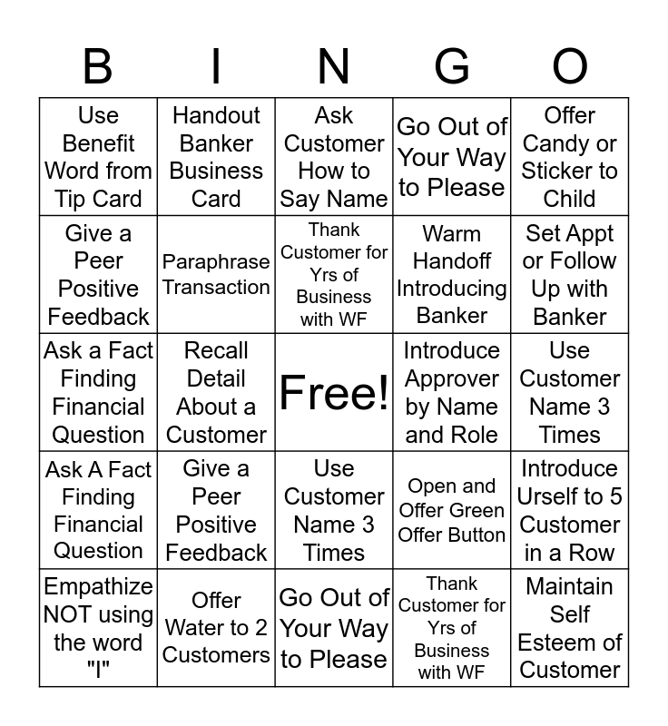 This bingo card has a free space and 24 words: Give a Peer Positive Feedback, Offer Water to 2 Customers, Thank Customer for Yrs of Business with WF, Empathize NOT using the word "I", Offer Candy or Sticker to Child, Use Benefit Word from Tip Card, Give a Peer Positive Feedback, Handout Banker Business Card, Introduce Approver by Name and Role, Use Customer Name 3 Times, Warm Handoff Introducing Banker, Ask a Fact Finding Financial Question, Open and Offer Green Offer Button, Introduce Urself to 5 Customer in a Row, Paraphrase Transaction, Thank Customer for Yrs of Business with WF, Use Customer Name 3 Times, Ask Customer How to Say Name, Set Appt or Follow Up with Banker, Recall Detail About a Customer, Maintain Self Esteem of Customer, Ask A Fact Finding Financial Question, Go Out of Your Way to Please and Go Out of Your Way to Please.