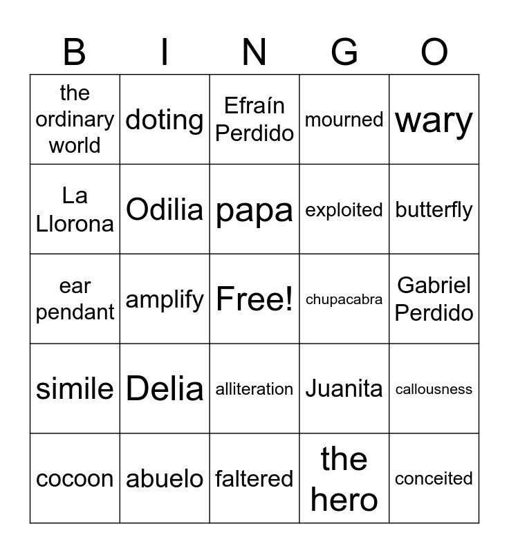 This bingo card has a free space and 47 words: Mama, conceited, Velia, faltered, Delia, succumbing, doting, desolate, La Llorona, profusely, Odilia, mourned, callousness, Juanita, Cecilia, the mentor, papa, chupacabra, quinceanera, wary, amplify, the hero, the ordinary world, exploited, mariposa, butterfly, cocoon, figurative, alliteration, simile, metaphor, hyperbole, personification, Pita, abuela, abuelo, Gabriel Perdido, Teresita, Nagual, Lechuzas, Inés Perdido, Efraín Perdido, ear pendant, apparition, symbol, omen and haven.