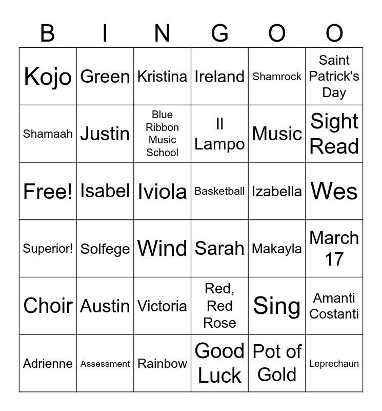 This bingo card has 36 words: Red, Red Rose, Victoria, Good Luck, Shamaah, Superior!, Basketball, Justin, Rainbow, Shamrock, Sing, Sight Read, Ireland, Amanti Costanti, Isabel, Il Lampo, Kojo, Choir, Izabella, Free!, Kristina, Iviola, Solfege, Sarah, Wind, Makayla, Green, Music, Assessment, Blue Ribbon Music School, Saint Patrick's Day, Leprechaun, Adrienne, March 17, Wes, Austin and Pot of Gold.