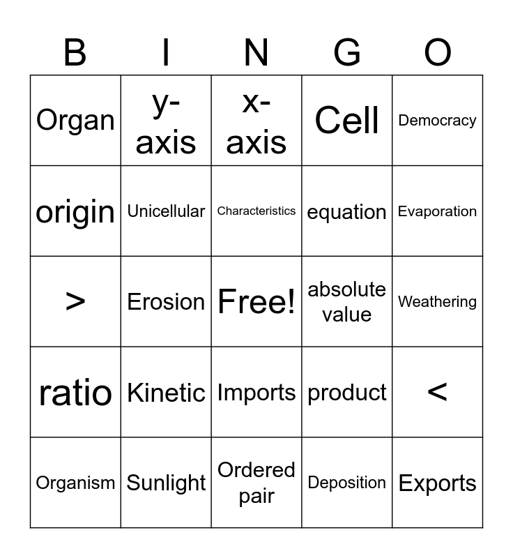 This bingo card has a free space and 27 words: product, quotient, equation, Ordered pair, origin, x-axis, y-axis, ratio, absolute value, <, >, Cell, Organism, Sunlight, Evaporation, Autotroph, Unicellular, Characteristics, Kinetic, Organ, Weathering, Deposition, Erosion, Exports, Imports, Democracy and Oligarchy.
