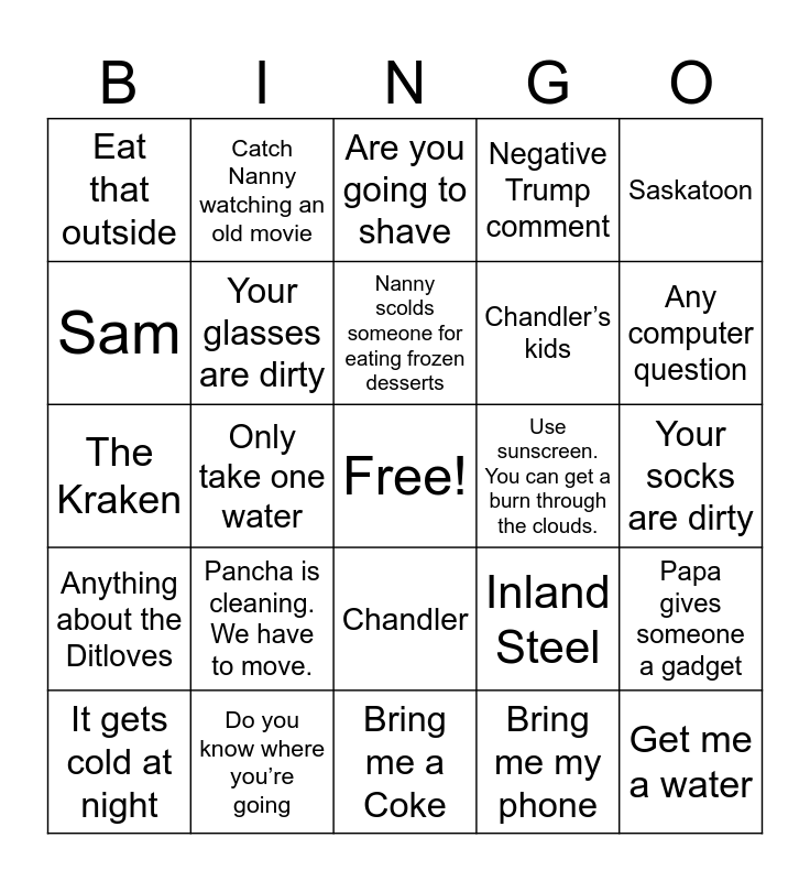 This bingo card has a free space and 29 words: It gets cold at night, Is that what you’re wearing, Only take one water, You’re making a mess, Eat that outside, Are you going to shave, Your glasses are dirty, Pancha is cleaning. We have to move., Use sunscreen. You can get a burn through the clouds., Do you know where you’re going, Your socks are dirty, Get me a water, Bring me a Coke, Bring me my phone, Any computer question, No phones in Tamarisk, Chandler, Anything about the Ditloves, Saskatoon, The Kraken, Inland Steel, Lunch, Chandler’s kids, Sam, Negative Trump comment, Catch Nanny watching an old movie, Papa gives someone a gadget, Nanny scolds someone for eating frozen desserts and Catch Nanny or Papa watching any court show.