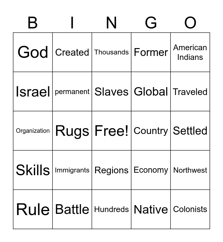 This bingo card has a free space and 24 words: Immigrants, Battle, Slaves, Rule, American Indians, God, Israel, Created, Country, Regions, Global, Organization, Economy, Northwest, permanent, Native, Settled, Thousands, Traveled, Rugs, Colonists, Skills, Former and Hundreds.