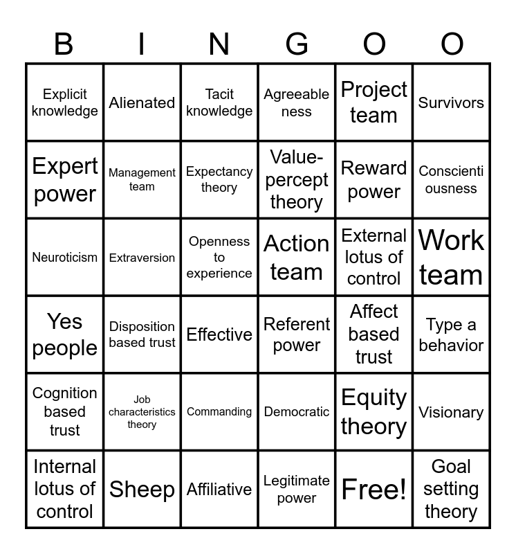 This bingo card has 41 words: Legitimate power, Reward power, Coercive power, Expert power, Referent power, Work team, Management team, Parallel team, Project team, Action team, Conscienti ousness, Agreeable ness, Neuroticism, Openness to experience, Extraversion, External lotus of control, Internal lotus of control, Explicit knowledge, Free!, Tacit knowledge, Disposition based trust, Cognition based trust, Affect based trust, Expectancy theory, Goal setting theory, Equity theory, Type a behavior, Type b behavior, Value-percept theory, Job characteristics theory, Affective events theory, Alienated, Effective, Sheep, Yes people, Survivors, Commanding, Visionary, Affiliative, Democratic and Coaching.