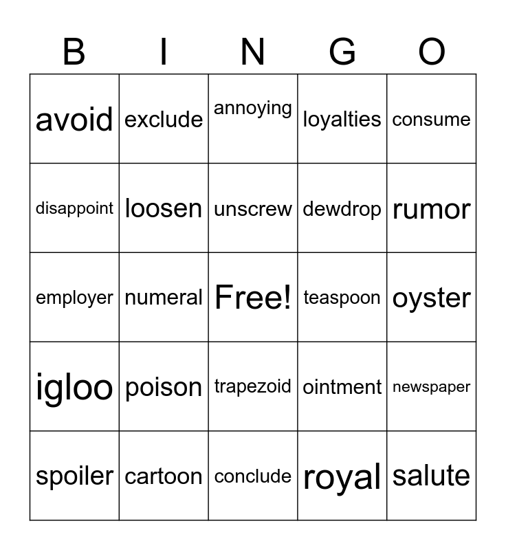 This bingo card has a free space and 27 words: ointment, substitute, dewdrop, conclude, disappoint, annoying, exclude, igloo, teaspoon, newspaper, employer, loyalties, spoiler, cartoon, rumor, homeroom, loosen, unscrew, poison, avoid, oyster, royal, numeral, salute, trapezoid, consume and renew.