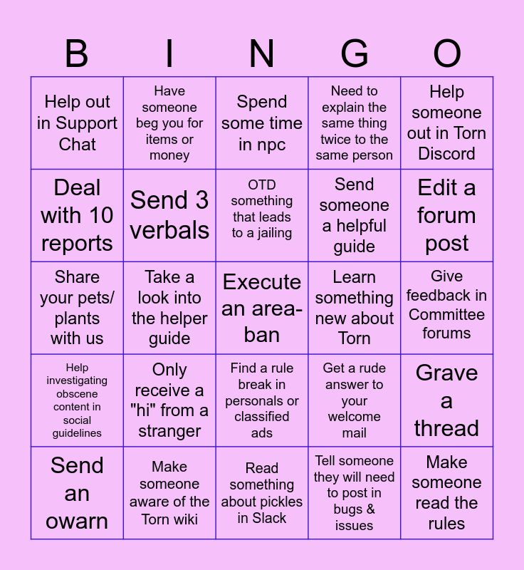 This bingo card has 25 words: Only receive a "hi" from a stranger, Read something about pickles in Slack, OTD something that leads to a jailing, Send an owarn, Help someone out in Torn Discord, Help out in Support Chat, Deal with 10 reports, Have someone beg you for items or money, Learn something new about Torn, Find a rule break in personals or classified ads, Send someone a helpful guide, Share your pets/ plants with us, Get a rude answer to your welcome mail, Grave a thread, Send 3 verbals, Make someone read the rules, Give feedback in Committee forums, Spend some time in npc, Edit a forum post, Take a look into the helper guide, Execute an area-ban, Make someone aware of the Torn wiki, Help investigating obscene content in social guidelines, Need to explain the same thing twice to the same person and Tell someone they will need to post in bugs & issues.