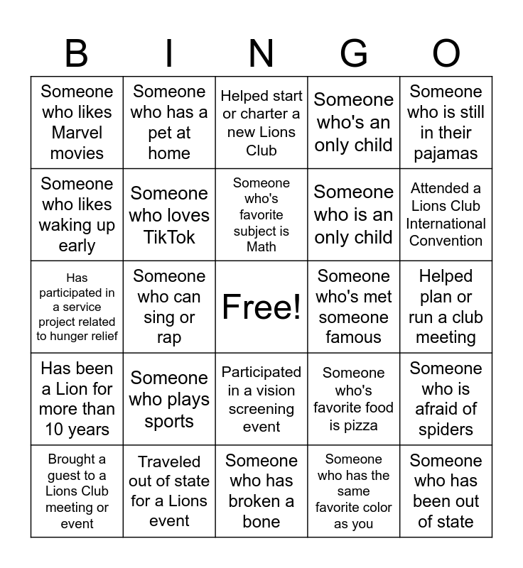 This bingo card has a free space and 49 words: Someone who has siblings, Someone who has been out of state, Someone with the same birthday month as you, Someone who has broken a bone, Someone who plays sports, Someone who wears glasses, Someone who has a pet at home, Some who is left-handed, Someone who likes waking up early, Someone who loves playing video games, Someone who loves TikTok, Someone who's an only child, Someone who is afraid of spiders, Someone who's favorite food is pizza, Someone who likes to dance, Someone who is a Lakers fan, Someone who's favorite subject is Math, Someone who's met someone famous, Someone who ate breakfast this morning, Someone who is still in their pajamas, Someone who can sing or rap, Someone who has the same favorite color as you, Someone who likes Marvel movies, Someone who is an only child, Has served as a club officer (President, Secretary, Treasurer, etc.), Attended a Lions Club International Convention, Brought a guest to a Lions Club meeting or event, Helped organize a fundraiser for a Lions project, Participated in a vision screening event, Has been a Lion for more than 10 years, Volunteered for a Lions Club community service project, Visited another Lions Club outside of their district, Sponsored a new member into a Lions Club, Has received a Lions Club award (Melvin Jones Fellow, etc.), Traveled out of state for a Lions event, Participated in a service project benefiting children, Donated glasses to the Lions Recycle for Sight program, Attended a Lions leadership training (RLLI, ELLI, etc.), Helped plan or run a club meeting, Served on a district or multiple district Lions committee, Has participated in a club membership drive, Can recite the Lions motto ("We Serve"), Knows the name of the current International Lions Club President, Has a Lions vest, shirt, or pin collection, Has participated in a service project related to hunger relief, Helped start or charter a new Lions Club, Has attended at least five club meetings in the past year, Worked with a Leo Club or young Lions members and Can share a personal story about how Lions Club has impacted their life.