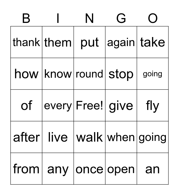 This bingo card has a free space and 25 words: after, any, once, open, take, thank, them, put, give, going, how, know, were, when, going, from, every, round, stop, fly, of, live, walk, again and an.