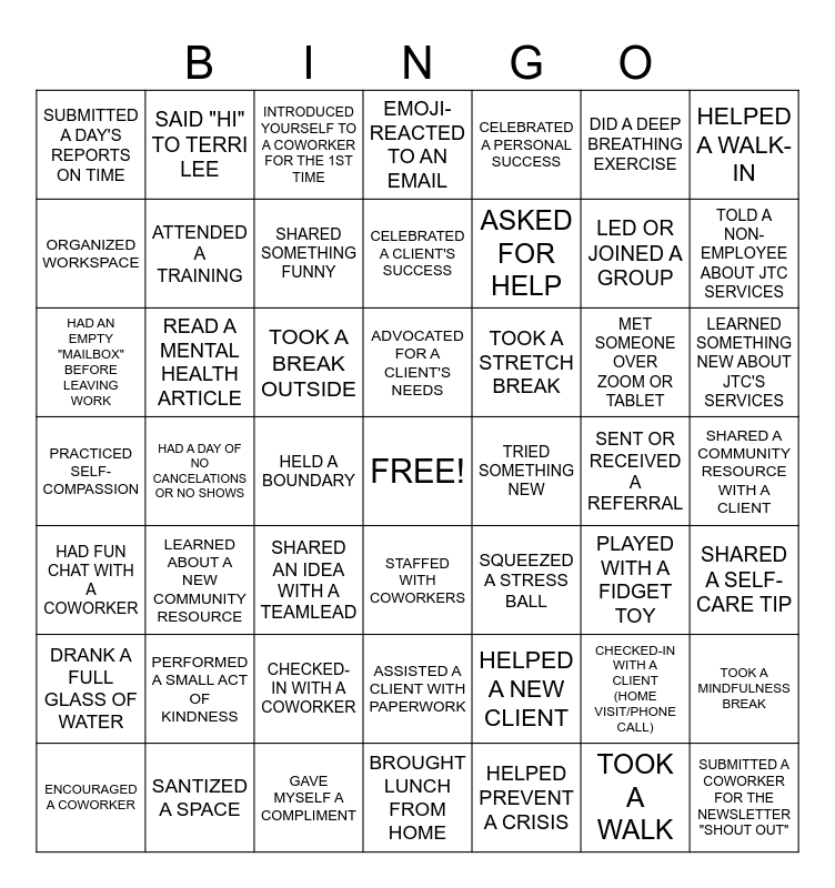 This bingo card has a free space and 48 words: HELPED A NEW CLIENT, LED OR JOINED A GROUP, BROUGHT LUNCH FROM HOME, HAD A DAY OF NO CANCELATIONS OR NO SHOWS, TOOK A BREAK OUTSIDE, SHARED A COMMUNITY RESOURCE WITH A CLIENT, SAID "HI" TO TERRI LEE, SANTIZED A SPACE, DID A DEEP BREATHING EXERCISE, STAFFED WITH COWORKERS, HELPED A WALK-IN, EMOJI-REACTED TO AN EMAIL, MET SOMEONE OVER ZOOM OR TABLET, TOOK A STRETCH BREAK, DRANK A FULL GLASS OF WATER, SENT OR RECEIVED A REFERRAL, ORGANIZED WORKSPACE, TOLD A NON-EMPLOYEE ABOUT JTC SERVICES, CHECKED-IN WITH A CLIENT (HOME VISIT/PHONE CALL), CELEBRATED A PERSONAL SUCCESS, ASKED FOR HELP, HELD A BOUNDARY, SUBMITTED A DAY'S REPORTS ON TIME, ATTENDED A TRAINING, TOOK A MINDFULNESS BREAK, SHARED SOMETHING FUNNY, LEARNED SOMETHING NEW ABOUT JTC'S SERVICES, ENCOURAGED A COWORKER, ADVOCATED FOR A CLIENT'S NEEDS, READ A MENTAL HEALTH ARTICLE, TOOK A WALK, TRIED SOMETHING NEW, SHARED A SELF-CARE TIP, PERFORMED A SMALL ACT OF KINDNESS, PRACTICED SELF-COMPASSION, SQUEEZED A STRESS BALL, PLAYED WITH A FIDGET TOY, HAD AN EMPTY "MAILBOX" BEFORE LEAVING WORK, SHARED AN IDEA WITH A TEAMLEAD, CHECKED-IN WITH A COWORKER, HAD FUN CHAT WITH A COWORKER, SUBMITTED A COWORKER FOR THE NEWSLETTER "SHOUT OUT", INTRODUCED YOURSELF TO A COWORKER FOR THE 1ST TIME, GAVE MYSELF A COMPLIMENT, CELEBRATED A CLIENT'S SUCCESS, ASSISTED A CLIENT WITH PAPERWORK, LEARNED ABOUT A NEW COMMUNITY RESOURCE and HELPED PREVENT A CRISIS.