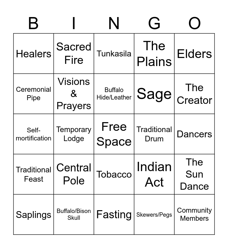 This bingo card has a free space and 24 words: Central Pole, Buffalo/Bison Skull, Buffalo Hide/Leather, Saplings, Elders, Healers, Ceremonial Pipe, Sacred Fire, Traditional Drum, Tobacco, Sage, Self-mortification, Indian Act, The Sun Dance, Visions & Prayers, Skewers/Pegs, Dancers, Tunkasila, The Creator, Temporary Lodge, Community Members, Traditional Feast, The Plains and Fasting.