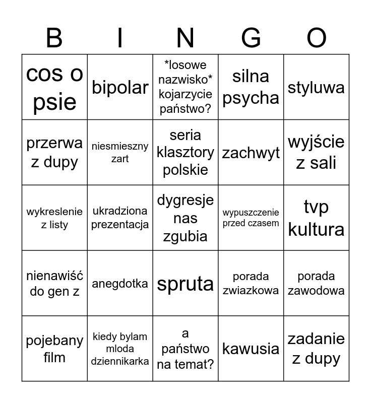 This bingo card has a free space and 24 words: anegdotka, kiedy bylam mloda dziennikarka, seria klasztory polskie, pojebany film, styluwa, cos o psie, przerwa z dupy, bipolar, wypuszczenie przed czasem, spruta, zachwyt, wykreslenie z listy, porada zwiazkowa, porada zawodowa, niesmieszny zart, kawusia, tvp kultura, *losowe nazwisko* kojarzycie państwo?, wyjście z sali, ukradziona prezentacja, zadanie z dupy, nienawiść do gen z, silna psycha and a państwo na temat?.
