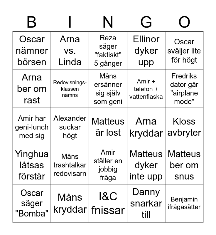 This bingo card has a free space and 24 words: Måns trashtalkar redovisarn, Måns kryddar, Måns ersänner sig själv som geni, Oscar säger "Bomba", Oscar sväljer lite för högt, Oscar nämner börsen, Arna ber om rast, Arna vs. Linda, Arna kryddar, Amir ställer en jobbig fråga, Amir + telefon + vattenflaska, Amir har geni-lunch med sig, Matteus dyker inte upp, Matteus ber om snus, Redovisnings-klassen nämns, Danny snarkar till, Kloss avbryter, Reza säger "faktiskt" 5 gånger, Fredriks dator går "airplane mode", Alexander suckar högt, Benjamin ifrågasätter, Yinghua låtsas förstår, Ellinor dyker upp and I&C fnissar.