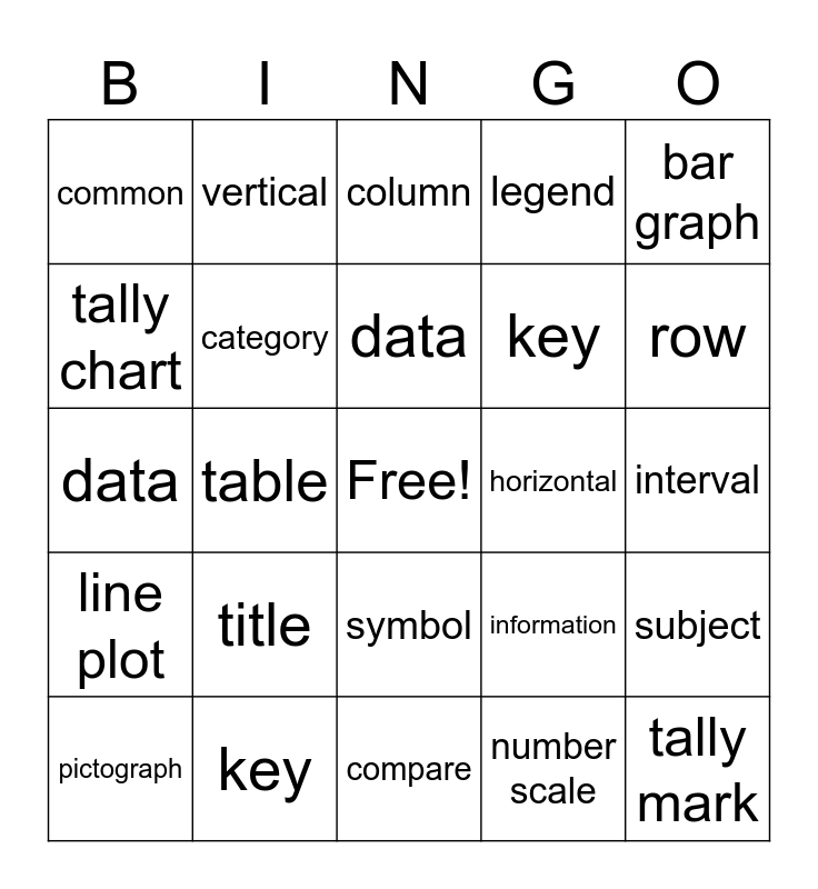 This bingo card has a free space and 24 words: title, key, data, pictograph, bar graph, common, tally chart, vertical, horizontal, symbol, key, data, information, subject, category, number scale, interval, column, row, table, tally mark, line plot, legend and compare.