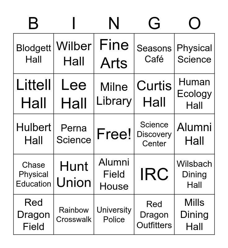 This bingo card has a free space and 42 words: Welcome Center, Milne Library, Netzer Administration, Hunt Union, Red Dragon Outfitters, Wilsbach Dining Hall, Mills Dining Hall, Fitzelle Hall, Fine Arts, Alumni Field House, Alumni Hall, Human Ecology Hall, Perna Science, Physical Science, Schumacher Hall, IRC, Tobey Hall, Hulbert Hall, Higgins Hall, Wilber Hall, Littell Hall, Golding Hall, Matteson Hal, Blodgett Hall, Macduff Hall, Huntington Hall, Curtis Hall, Hays Hall, Campus Pond, Old Main Pillars, President’s Garden, Chase Physical Education, Lee Hall, University Police, Health & Wellness Center, Red Dragon Field, Rainbow Crosswalk, Science Discovery Center, Campus Bus Stop, Argo Tea Café, Seasons Café and Starbucks.