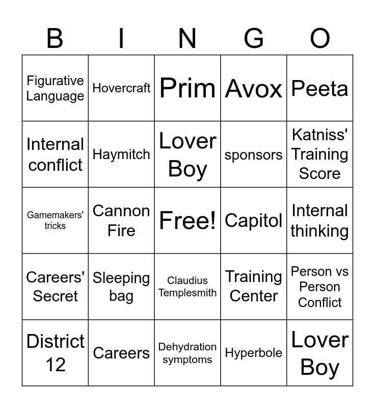 This bingo card has a free space and 24 words: Sleeping bag, Careers, Lover Boy, District 12, Peeta, Figurative Language, Internal conflict, Hovercraft, Capitol, Claudius Templesmith, sponsors, Gamemakers' tricks, Training Center, Person vs Person Conflict, Haymitch, Hyperbole, Internal thinking, Prim, Katniss' Training Score, Cannon Fire, Lover Boy, Careers' Secret, Avox and Dehydration symptoms.