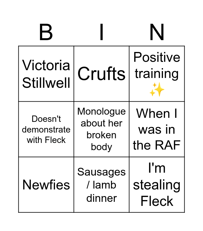 This bingo card has 9 words: Newfies, Positive training ✨, Crufts, Doesn't demonstrate with Fleck, Victoria Stillwell, When I was in the RAF, Monologue about her broken body, I'm stealing Fleck and Sausages / lamb dinner.