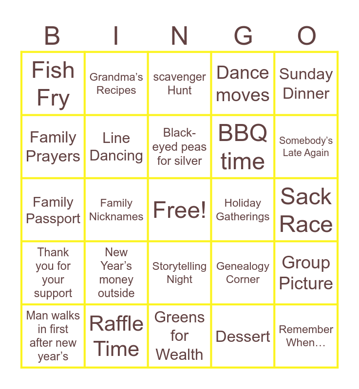 This bingo card has a free space and 25 words: New Year’s money outside, Greens for Wealth, Black-eyed peas for silver, Man walks in first after new year’s, Sunday Dinner, Fish Fry, Family Prayers, Grandma’s Recipes, Holiday Gatherings, Storytelling Night, BBQ time, Family Passport, Genealogy Corner, Group Picture, Line Dancing, Tug of war, Sack Race, scavenger Hunt, Somebody’s Late Again, Family Nicknames, Remember When…, Raffle Time, Thank you for your support, Dance moves and Dessert.