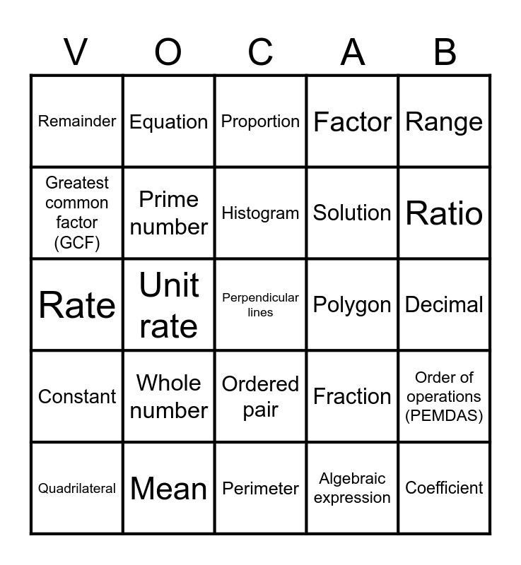 This bingo card has 58 words: Integer, Whole number, Rational number, Fraction, Decimal, Percent, Prime number, Composite number, Factor, Multiple, Greatest common factor (GCF), Least common multiple (LCM), Divisor, Dividend, Quotient, Remainder, Unit rate, Proportion, Equivalent ratios, Ratio, Rate, Equation, Variable, Algebraic expression, Percent, Constant, Parallel lines, Inequality, Solution, Coefficient, Distributive property, Area, Angle, Right angle, Order of operations (PEMDAS), Obtuse angle, X-axis / Y-axis, Perpendicular lines, Polygon, Acute angle, Quadrilateral, Mean, Perimeter, Volume, Triangle, Coordinate plane, Data set, Ordered pair, Mode, Surface area, Outlier, Dependent event, Median, Probability, Range, Independent event, Histogram and Sample space.