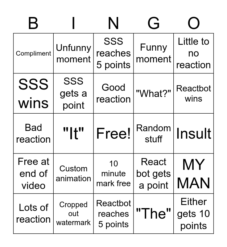 This bingo card has a free space and 24 words: Lots of reaction, Custom animation, Good reaction, "The", Little to no reaction, Compliment, Unfunny moment, SSS reaches 5 points, Random stuff, Insult, Bad reaction, SSS gets a point, React bot gets a point, MY MAN, SSS wins, Cropped out watermark, Reactbot reaches 5 points, Funny moment, Reactbot wins, Free at end of video, "It", 10 minute mark free, "What?" and Either gets 10 points.