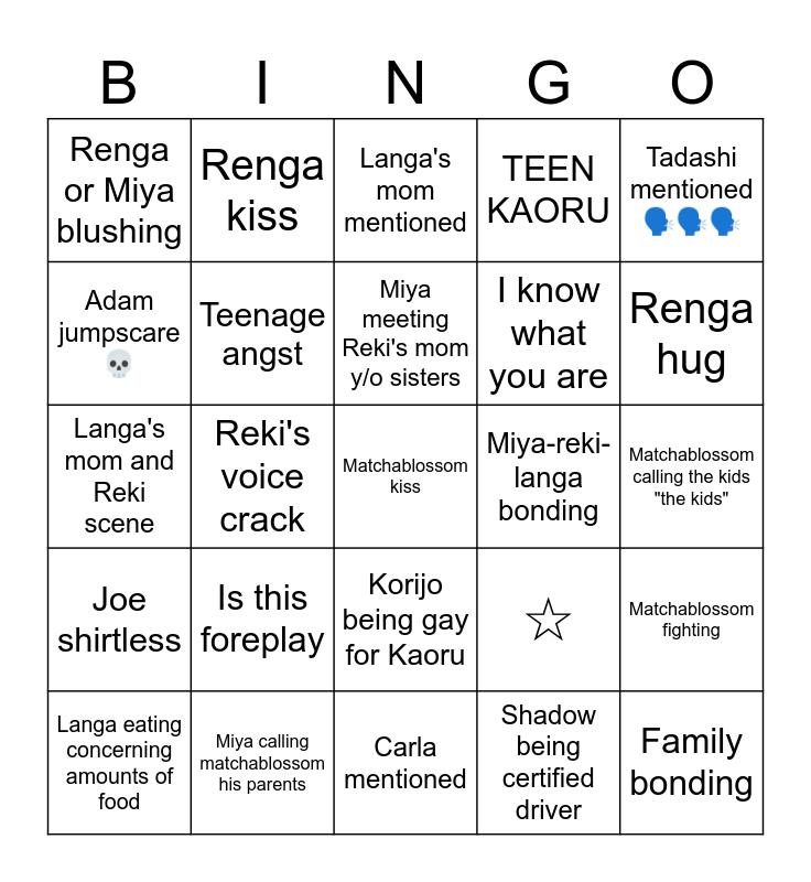 This bingo card has 25 words: Is this foreplay, Carla mentioned, Miya meeting Reki's mom y/o sisters, Langa eating concerning amounts of food, Tadashi mentioned 🗣️🗣️🗣️, Renga or Miya blushing, Adam jumpscare 💀, Renga kiss, Miya-reki-langa bonding, Korijo being gay for Kaoru, I know what you are, Langa's mom and Reki scene, ☆, Matchablossom fighting, Teenage angst, Family bonding, Matchablossom calling the kids "the kids", Langa's mom mentioned, Renga hug, Reki's voice crack, Matchablossom kiss, Miya calling matchablossom his parents, Joe shirtless, TEEN KAORU and Shadow being certified driver.