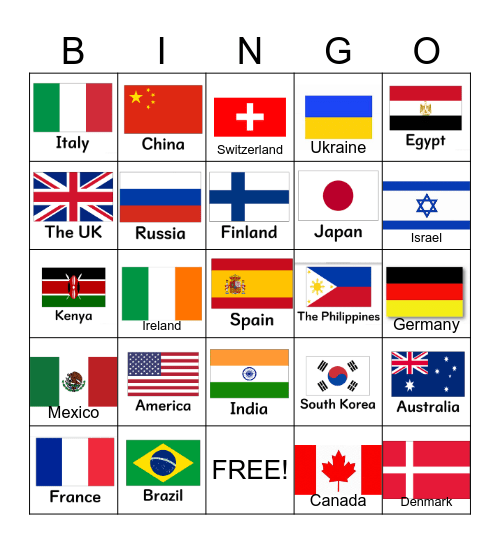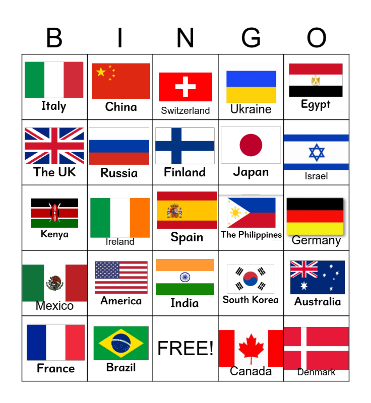 This bingo card has 23 images, a free space and 9 words: Canada, Germany, Switzerland, Israel, Ireland, Denmark, Mexico, Ukraine and FREE!.