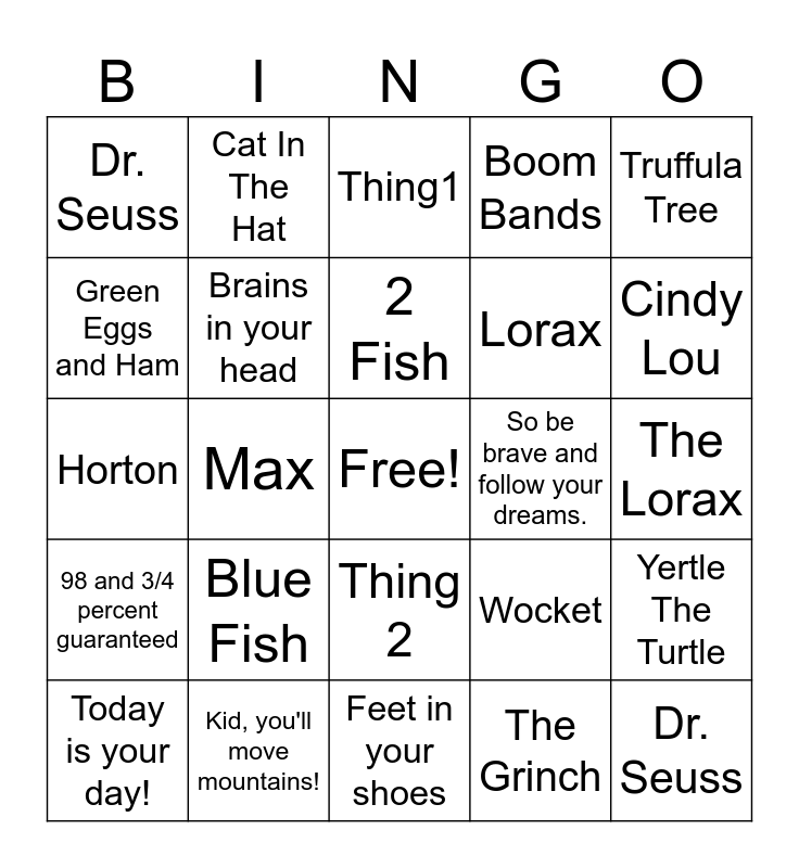This bingo card has a free space and 42 words: 1 Fish, 2 Fish, Red Fish, Blue Fish, The Grinch, Yertle The Turtle, Dr. Seuss, Sam-I-Am, Thing1, Thing 2, The Lorax, Cindy Lou, Max, Truffula Tree, Zizzer Zazzer Zuzz, Wocket, Hop On Pop, Horton, Dr. Seuss ABC, Cat In The Hat, Green Eggs and Ham, March 2, Fox In Socks, Dr. Seuss, Mulberry Street, Who-ville, Lorax, Butter Battle, The Grinch, Diffendoofer Day, Oh, the Places You'll Go!, 98 and 3/4 percent guaranteed, Brains in your head, Feet in your shoes, You're off to great places!, Today is your day!, Kid, you'll move mountains!, So be brave and follow your dreams., You'll be best of the best!, Prickle-ly perch, Boom Bands and You'll find the bright places.