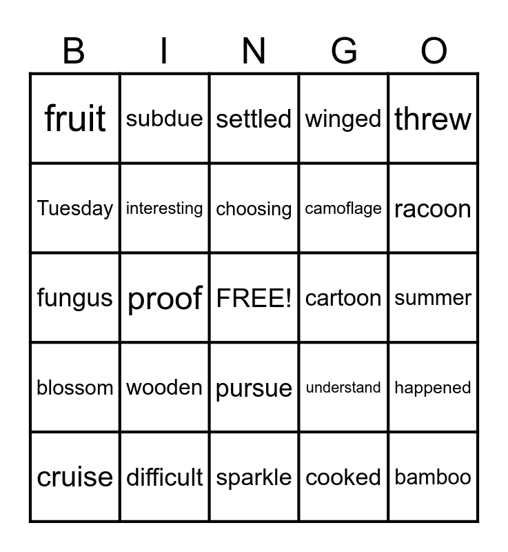 This bingo card has a free space and 24 words: wooden, difficult, choosing, cruise, threw, fruit, Tuesday, subdue, cartoon, pursue, camoflage, fungus, understand, happened, interesting, cooked, summer, settled, racoon, proof, bamboo, blossom, winged and sparkle.