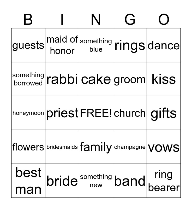 This bingo card has a free space and 27 words: champagne, wedding dress, groom, something new, something borrowed, something blue, maid of honor, flowers, church, vows, honeymoon, rings, best man, bride, kiss, veil, rabbi, cake, bridesmaids, guests, gifts, band, priest, ring bearer, family, dance and food.