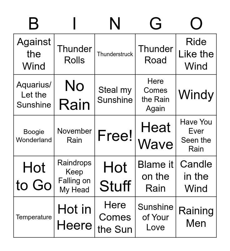 This bingo card has a free space and 52 words: SIngin’ in the Rain, Raining Men, Riders on the Storm, Here Comes the Sun, Raindrops Keep Falling on My Head, Rock You Like a Hurricane, Thunder Rolls, Dreams, Aquarius/ Let the Sunshine, Walking on Sunshine, No Rain, Shelter From the Storm, Candle in the Wind, Blame it on the Rain, Ain’t No Sunshine, Dust in the Wind, Steal my Sunshine, Heat Wave, I Can See Clearly Now, Ride Like the Wind, November Rain, Sunshine of Your Love, Against the Wind, Here Comes the Rain Again, You are the Sunshine of My Life, Beautiful Day, Lovely Day, Snowbird, Windy, Umbrella, Only Happy When it Rains, Thunder Road, Rain on Me, Thunder (Imagine Dragons), Set Fire to the Rain, Thunderstruck, Hot in Heere, Sandstorm, Sunshine on My Shoulders, She’s Like the Wind, Fire and Rain (James Taylor), Have You Ever Seen the Rain, Hot to Go, Hot Fun in the Summertime, Hot Stuff, Hot for Teacher, Hot, Hot, Hot, Boogie Wonderland, Soak Up the Sun, Walking on the Sun, Temperature and The Rain (Juice Jones).