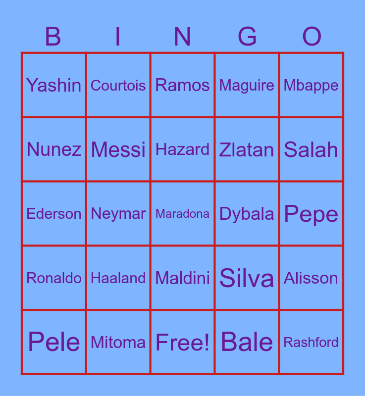 This bingo card has 25 words: Ronaldo, Mitoma, Maradona, Bale, Mbappe, Yashin, Courtois, Ramos, Dybala, Alisson, Nunez, Messi, Free!, Silva, Salah, Pele, Neymar, Hazard, Zlatan, Pepe, Ederson, Haaland, Maldini, Maguire and Rashford.