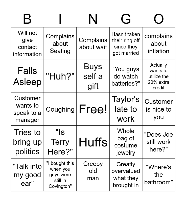 This bingo card has a free space and 24 words: "Is Terry Here?", "I bought this when you guys were still in Covington", Buys self a gift, "Talk into my good ear", complains about inflation, Will not give contact information, Falls Asleep, Complains about Seating, Taylor's late to work, Huffs, "You guys do watch batteries?", Customer wants to speak to a manager, Whole bag of costume jewelry, "Does Joe still work here?", "Huh?", Greatly overvalued what they brought in, Customer is nice to you, Complains about wait, Actually wants to utilize the 20% extra credit, Coughing, "Where's the bathroom", Tries to bring up politics, Hasn't taken their ring off since they got married and Creepy old man.