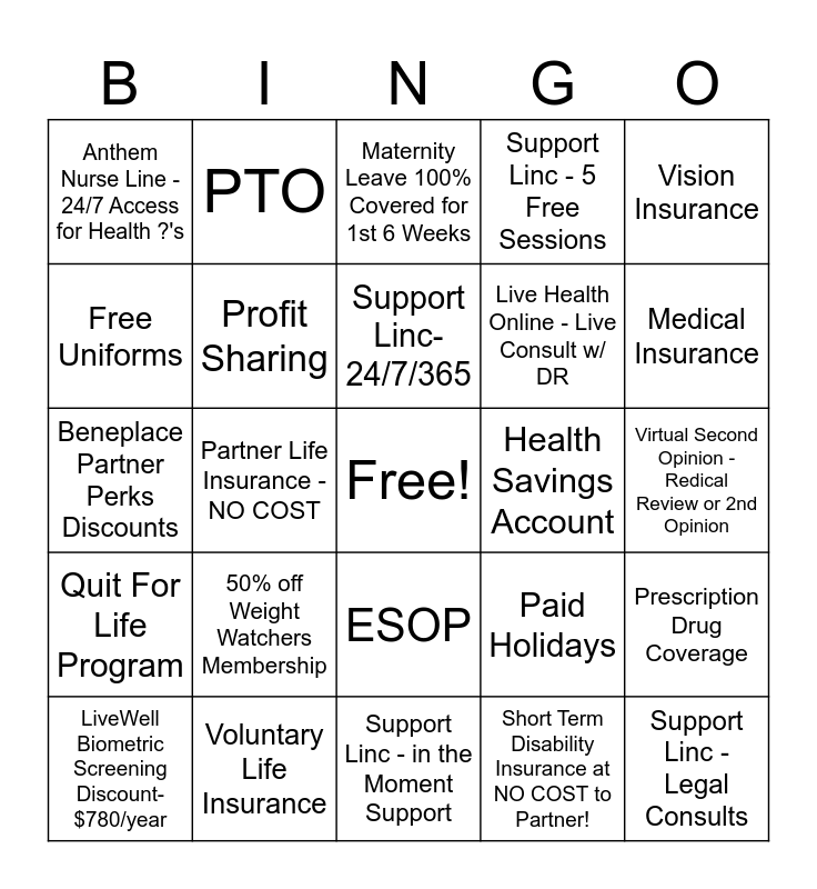 This bingo card has a free space and 34 words: Dental Insurance 2 Cleanings per year, Short Term Disability Insurance at NO COST to Partner!, Weekends Off, 401(k), Quit For Life Program, Profit Sharing, Vision Insurance, LiveWell Biometric Screening Discount- $780/year, PTO, Paternity Leave, Support Linc- 24/7/365, Maternity Leave 100% Covered for 1st 6 Weeks, Prudential Financial Wellness, Flexible Spending Account, Health Savings Account, Medical Insurance, Voluntary Life Insurance, Beneplace Partner Perks Discounts, 50% off Weight Watchers Membership, Paid Holidays, ESOP, Dependent Care Flexible Spending, Anthem Nurse Line - 24/7 Access for Health ?'s, Virtual Second Opinion - Redical Review or 2nd Opinion, Support Linc - in the Moment Support, Support Linc - Legal Consults, Support Linc - 5 Free Sessions, Support Linc - Referrals for Care, Home Repair, Housing Needs, etc., Live Health Online - Live Consult w/ DR, Free Uniforms, Bereavement Time, Partner Life Insurance - NO COST, Prescription Drug Coverage and Long Term Disability.