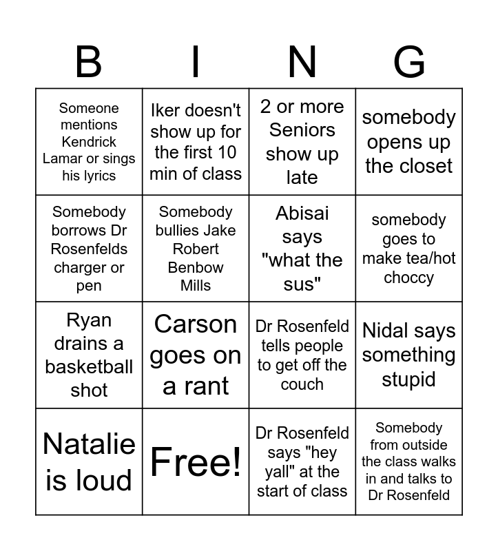 This bingo card has 16 words: Free!, Nidal says something stupid, 2 or more Seniors show up late, Someone mentions Kendrick Lamar or sings his lyrics, Ryan drains a basketball shot, Iker doesn't show up for the first 10 min of class, Dr Rosenfeld tells people to get off the couch, Dr Rosenfeld says "hey yall" at the start of class, Somebody borrows Dr Rosenfelds charger or pen, Somebody bullies Jake Robert Benbow Mills, Natalie is loud, somebody opens up the closet, Carson goes on a rant, somebody goes to make tea/hot choccy, Abisai says "what the sus" and Somebody from outside the class walks in and talks to Dr Rosenfeld.