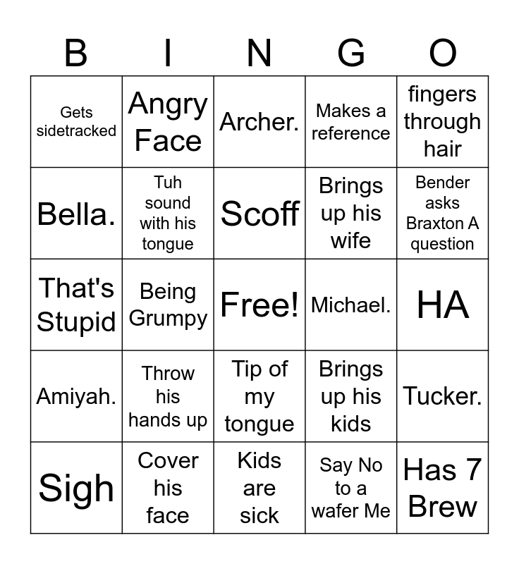 This bingo card has a free space and 24 words: Throw his hands up, Cover his face, Scoff, Sigh, fingers through hair, Gets sidetracked, Bella., Angry Face, Michael., Tip of my tongue, Brings up his wife, That's Stupid, Brings up his kids, Tucker., Tuh sound with his tongue, Say No to a wafer Me, HA, Archer., Bender asks Braxton A question, Being Grumpy, Has 7 Brew, Amiyah., Makes a reference and Kids are sick.