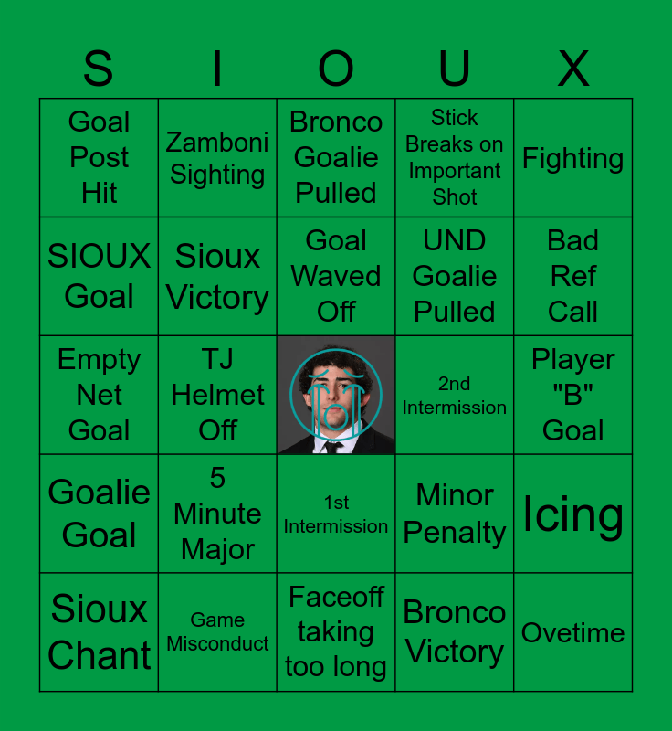 This bingo card has a free space and 24 words: 5 Minute Major, Game Misconduct, Goal Waved Off, Sioux Chant, Fighting, Goal Post Hit, SIOUX Goal, Zamboni Sighting, 2nd Intermission, 1st Intermission, UND Goalie Pulled, Empty Net Goal, Minor Penalty, Icing, Sioux Victory, Bronco Victory, Player "B" Goal, Bronco Goalie Pulled, Bad Ref Call, TJ Helmet Off, Ovetime, Goalie Goal, Stick Breaks on Important Shot and Faceoff taking too long.