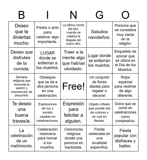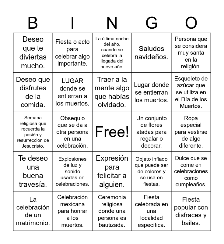This bingo card has a free space and 54 words: Voici les définitions sans les mots en début de ligne :, Te deseo una buena travesía., Deseo que tu viaje sea muy agradable., Felicidades por algo que lograste., Expresión para felicitar a alguien., ¡Felicidades en tu día especial!, Saludos navideños., Deseo que disfrutes tu comida., Deseo que disfrutes de la comida., Espero que disfrutes y te diviertas., Deseo que te diviertas mucho., Flor mexicana de color naranja, usada en el Día de los Muertos., Celebración mexicana para honrar a los muertos., La celebración de un matrimonio., Actividad donde se mueve el cuerpo al ritmo de la música., Ceremonia religiosa donde una persona es bautizada., Fiesta popular con disfraces y bailes., Lugar donde se entierran los muertos., El día de nacimiento de una persona., Ropa especial para vestirse de algo diferente., Objeto inflado que puede ser de colores y se usa en fiestas., Cosméticos usados para embellecer el rostro., Un conjunto de flores atadas para regalar o decorar., Persona que se considera muy santa en la religión., Ceremonia para unir a dos personas en matrimonio., Fiesta o acto para celebrar algo importante., Una fiesta que se hace con la familia., Baile típico de una región o cultura., Reunión para celebrar algo., Fiesta celebrada en una localidad específica., Fiesta celebrada a nivel nacional., Fiesta con significado religioso., Celebración cristiana que conmemora el nacimiento de Jesús., La noche del 24 de diciembre, víspera de Navidad., La última noche del año, cuando se celebra la llegada del nuevo año., Ceremonia religiosa donde una persona recibe el sacramento de la Eucaristía., Semana religiosa que recuerda la pasión y resurrección de Jesucristo., Dulce que se come en celebraciones como cumpleaños., Costumbre que se transmite de generación en generación., LUGAR donde se entierran a los muertos., Objeto que se enciende y da luz., Fiesta religiosa en honor a un santo patrón., Plantas que suelen ser coloridas y decorativas., Tiras de papel que se lanzan en fiestas., Explosiones de luz y sonido usadas en celebraciones., Las personas a quienes queremos y que son importantes., Persona que ha fallecido., Decoración hecha con papel recortado, típica en el Día de los Muertos., Traer a la mente algo que habías olvidado., Obsequio que se da a otra persona en una celebración., Esqueleto de azúcar que se utiliza en el Día de los Muertos., Adorno hecho con flores que se pone en la cabeza., Altar que se pone en el Día de los Muertos para honrar a los muertos. and Candelilla que se utiliza para iluminar..