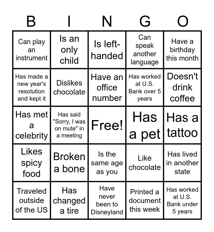 This bingo card has a free space and 24 words: Traveled outside of the US, Broken a bone, Have an office number, Printed a document this week, Have a birthday this month, Can play an instrument, Is an only child, Is left-handed, Has a pet, Has a tattoo, Has met a celebrity, Dislikes chocolate, Like chocolate, Has lived in another state, Has made a new year's resolution and kept it, Has changed a tire, Have never been to Disneyland, Can speak another language, Doesn't drink coffee, Likes spicy food, Has said "Sorry, I was on mute" in a meeting, Is the same age as you, Has worked at U.S. Bank over 5 years and Has worked at U.S. Bank under 5 years.